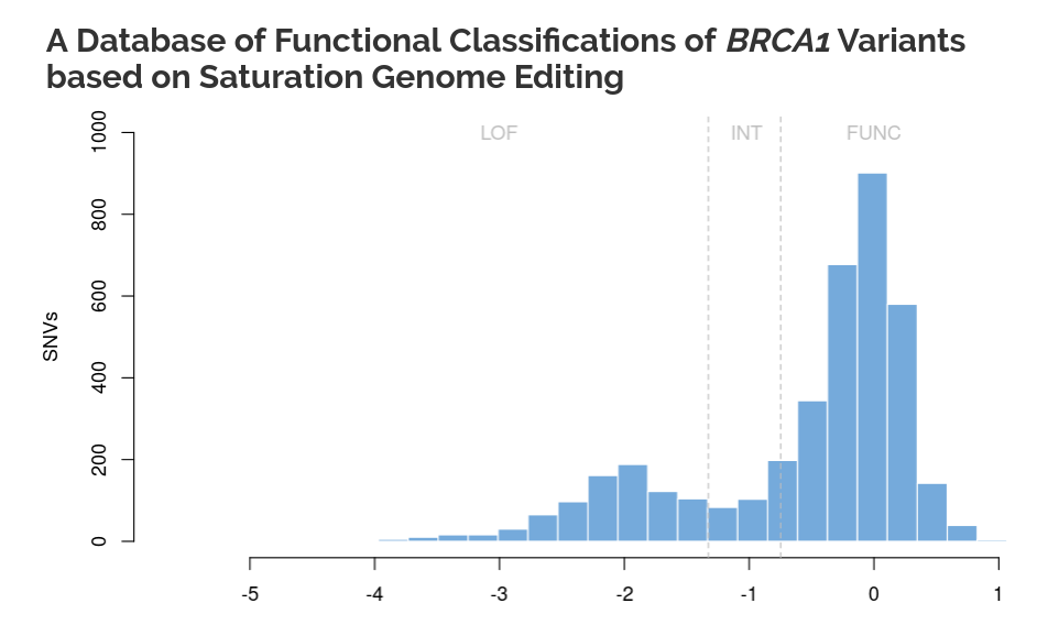 This chart shows the distribution of scores for different single nucleotide variants of BRCA1. The largest peak is around a score of 0, indicating that a lot of variants are pretty much harmless, but the other peak shows the variants which cause "loss of function", and thus increased risk of cancer developing.
