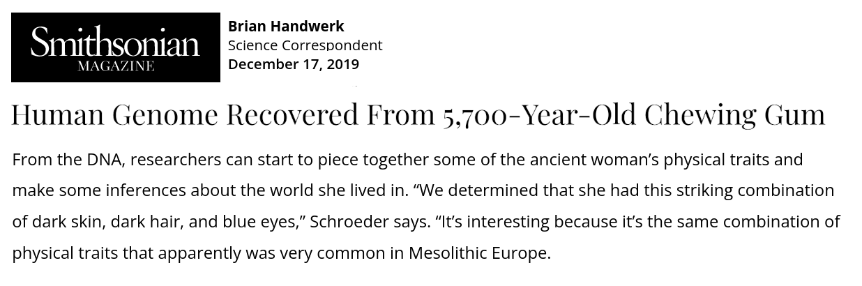 Reference: Human Genome Recovered From 5,700-Year-Old Chewing Gum