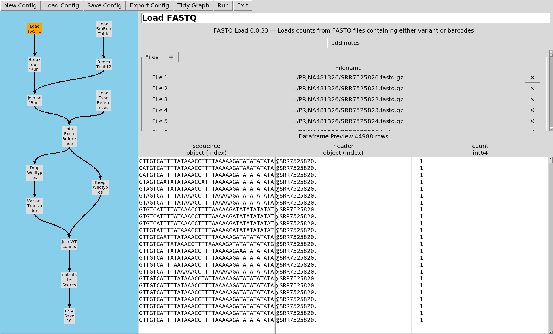 That data is in 163 FASTQ files, so the first thing we do is load those up. This plugin can also count up the number of repeats of the same sequence in a file, so we'll do that as well.