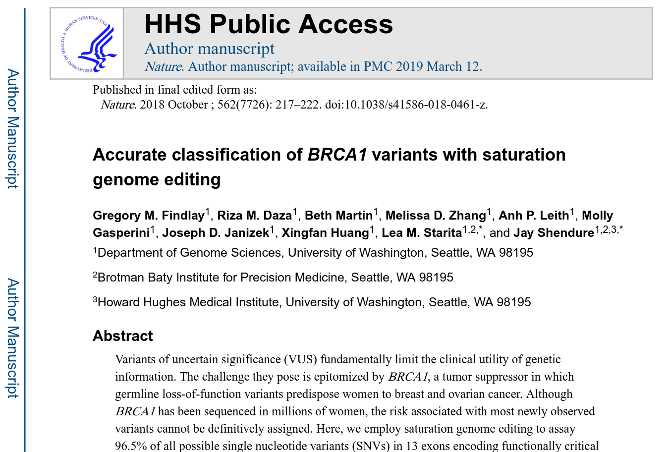 This paper uses Saturation Genome Editing to analyze almost 4000 single-base variants of BRCA1. For each variant, the effect on cell growth is assessed by counting the variants in the cell population after 11 days. The results show good correlation with the variants we already know of clinically and also identifies new pathogenic variants. Similar work is underway to analyse other tumor suppressing genes such as BRCA2 and PALB2.