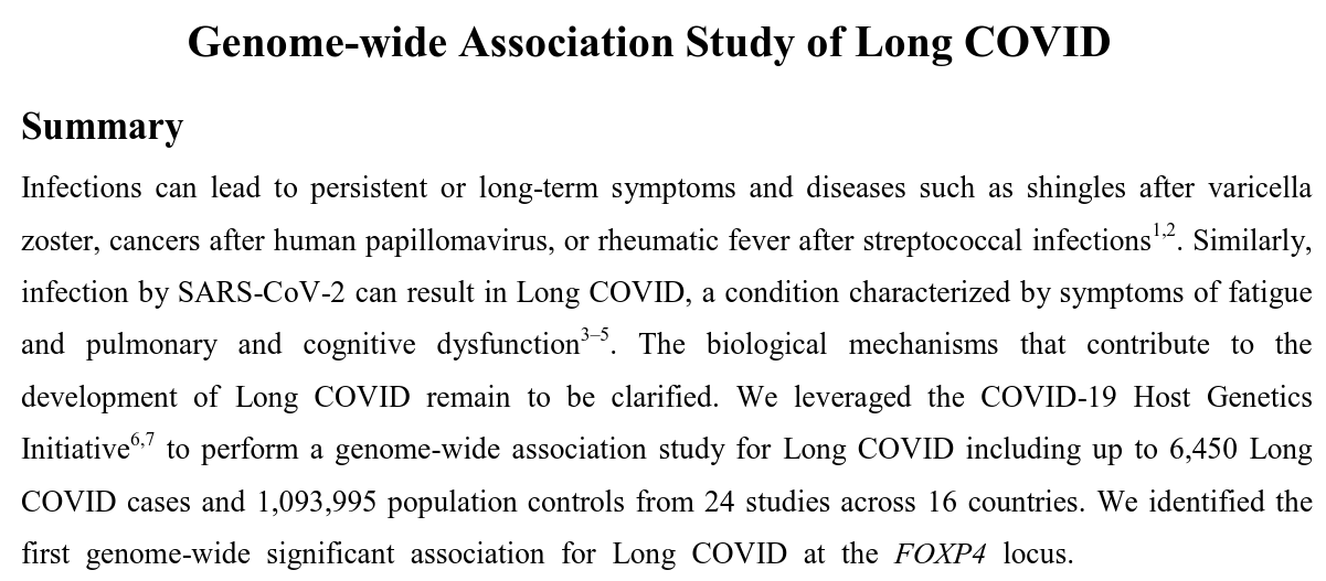 As another example, recent work published on MedRXiv suggests a link between specific variants of FOXP4 and severity of COVID infection as well as susceptibility to Long COVID.