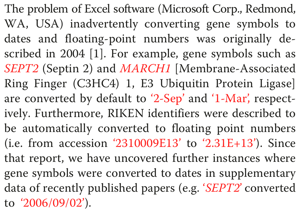A lot of analysis work used to be done in spreadsheets, but in recent years data sizes have grown faster than spreadsheets have kept up. Plus there's a few foot-guns to be found in Excel's handling of gene names such as SEPT2 and alphanumeric identifiers with a single E in them.