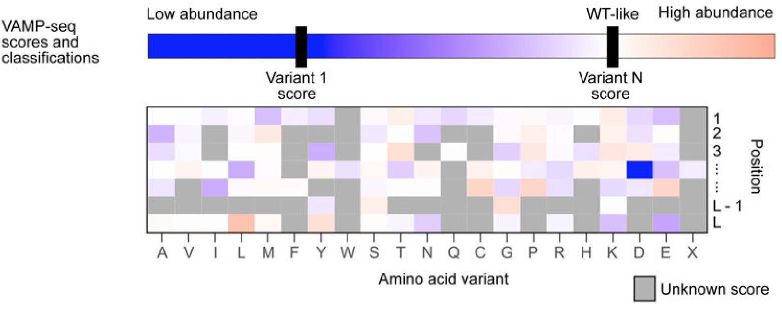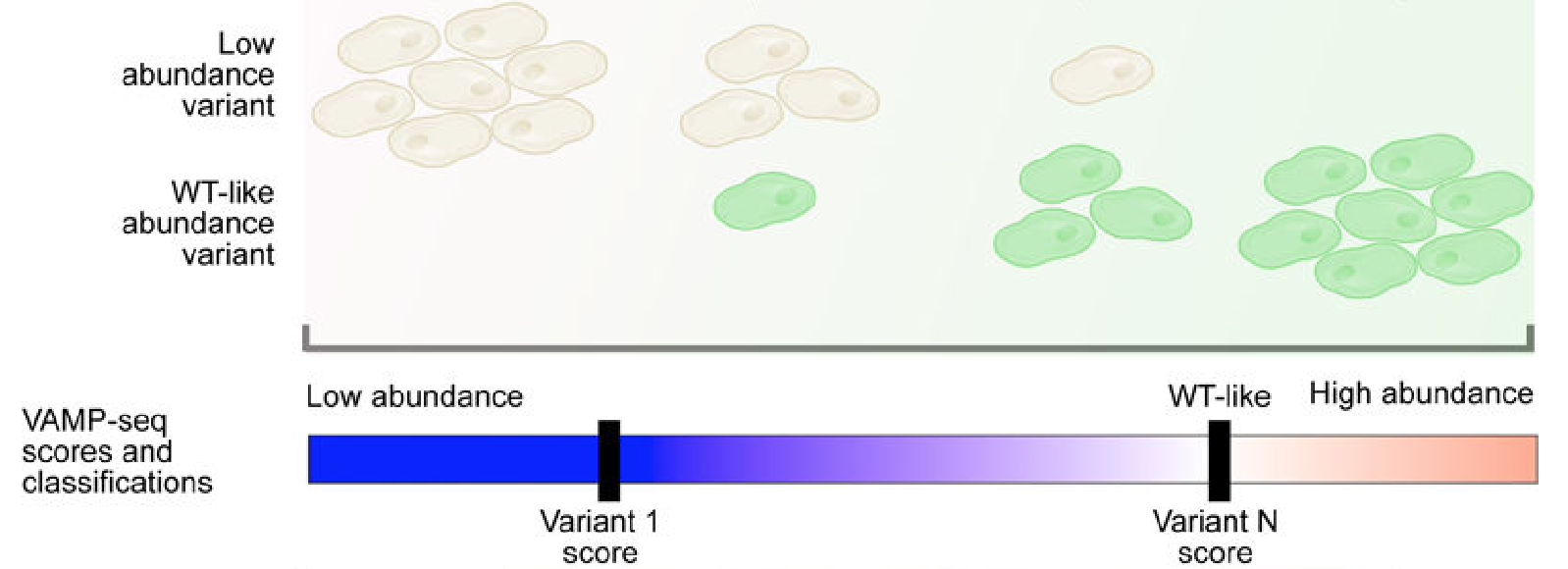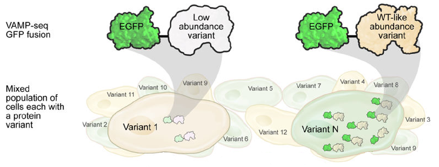 The VAMP-seq technique produces cells of each possible gene variant, like SGE, but also adds the sequence to create a fluorescent protein called EGFP, derived from a jellyfish protein.