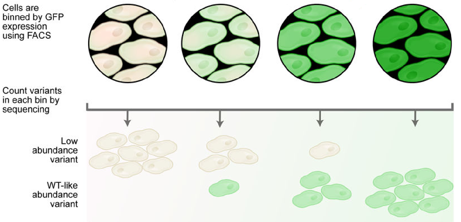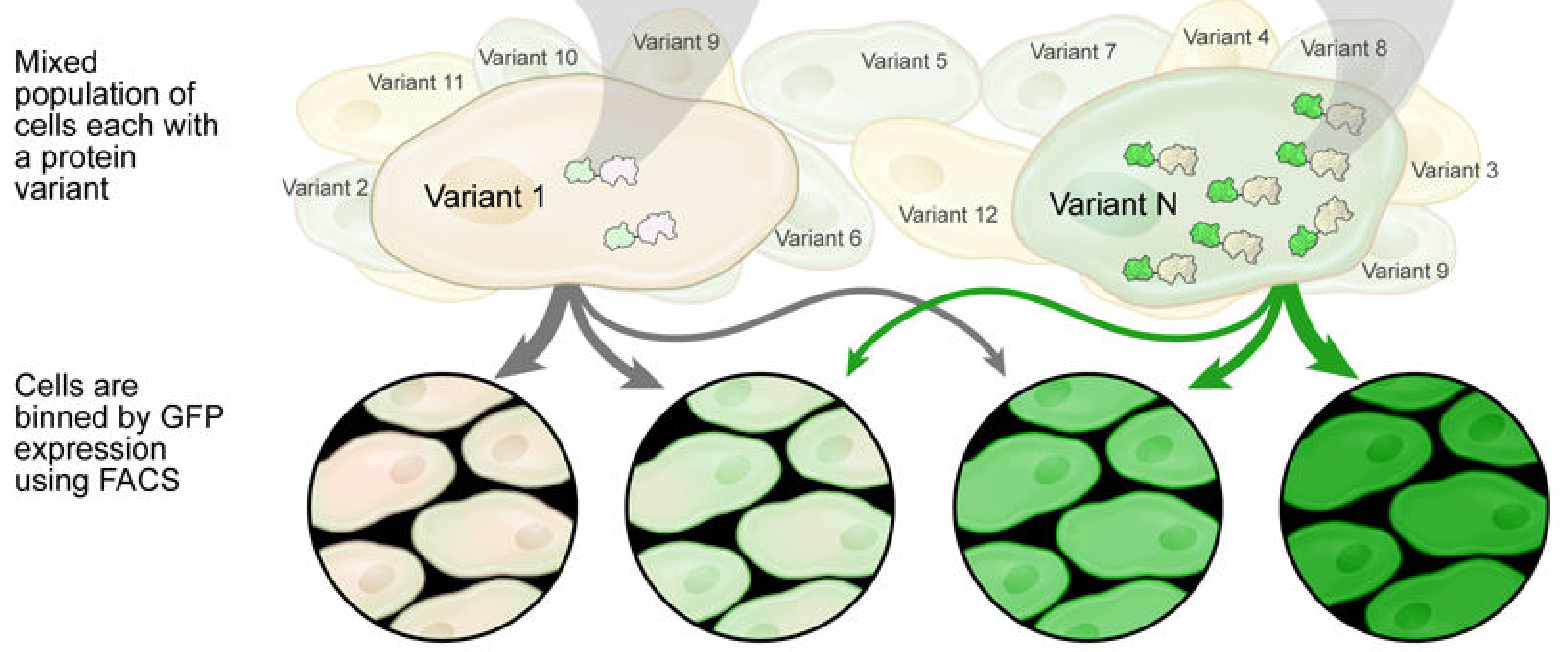 Each bin is then sequenced, and the population of each variant in each bin is counted.